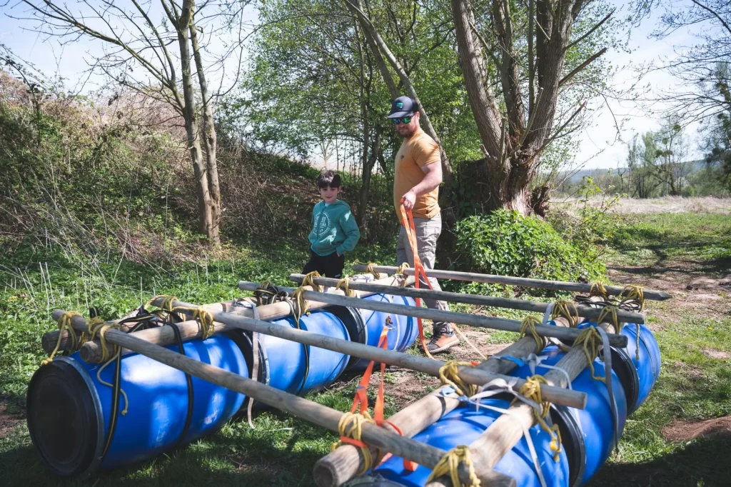 Parmi elles, une activité originale : construire son propre radeau et voguer sur la Meuse ! Jérémy d’O2 sports de la Maison des randonnées guide l’apprenti pas à pas : de longs bâtons en bois, des bidons et des cordes assemblés à grand renfort de nœuds donneront forme au radeau. Moins d’une heure de fabrication suivi d’un test de flottabilité, et départ pour une navigation originale sur la Meuse et une découverte de la nature environnante.