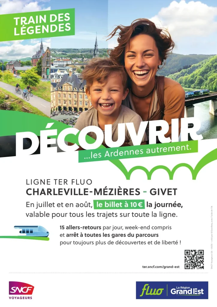Durant tout l’été du 1er juillet au 31 août, la région Grand Est et la SNCF vous proposent de sillonner la vallée de la Meuse dans les Ardennes avec le pass 1 jour à 10 euros. Vous pourrez voyager de manière illimitée sur les TER de la ligne Charleville-Givet tout au long de la journée. Tous les trains desservent l’ensemble des 15 gares du parcours. Vous pourrez ainsi découvrir à votre rythme et suivant vos envies les différents sites qui sont autant de points de départ pour découvrir cette belle région.