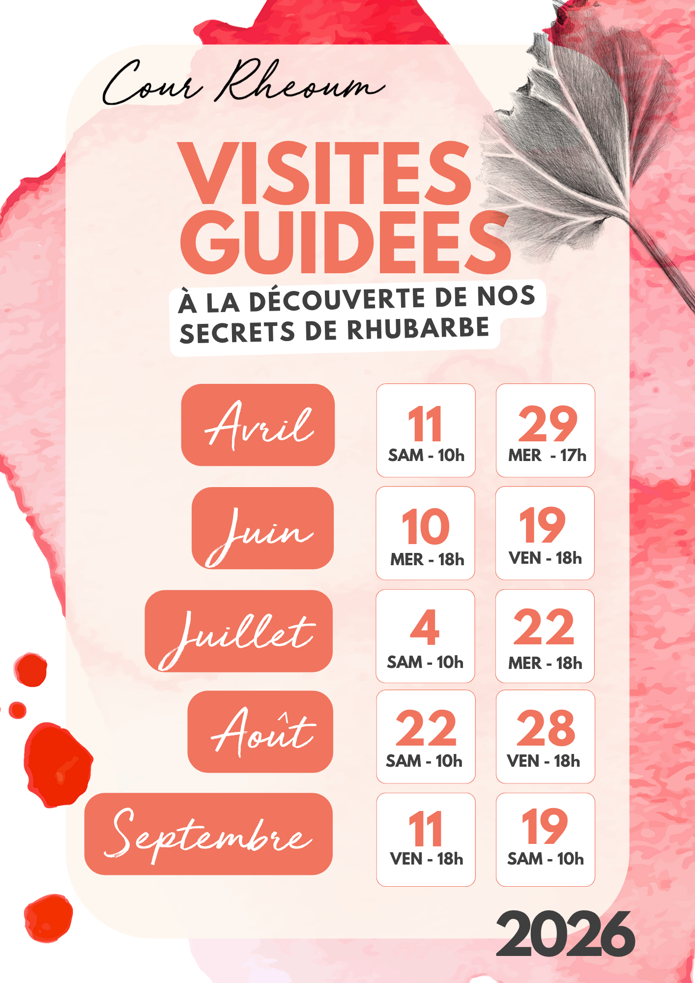 Du 11 avril au 19 septembre 2026, Cour Rheoum propose au grand public une série de visites guidées intitulées “Secrets de Rhubarbe”. Une activité unique et originale, idéale pour les familles, les amoureux du terroir ardennais, mais aussi pour les groupes dans le cadre d’un événement professionnel.
