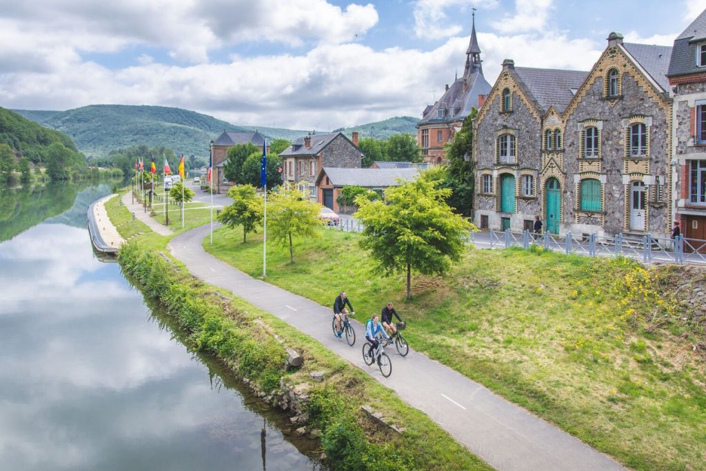 A la confluence de la Semoy et de la Meuse, Monthermé se niche dans l’un des plus beaux méandre du fleuve, ce qui lui vaut son surnom de perle des Ardennes. Sur votre parcours, la vallée encaissée est riche de forêts et de légendes. La Meuse à vélo, aménagée en voie verte sécurisée le long du chemin de halage vous conduit jusqu’à Fumay, l’une des villes emblématiques de l’extraction de l’ardoise bleue des Ardennes.